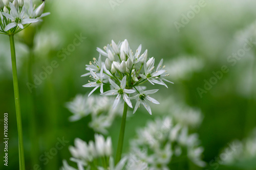 Allium ursinum wild bears garlic flowers in bloom, white rmasons buckrams flowering plants, green edible tasty healhty leaves