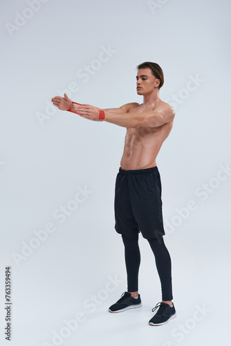 alluring athletic young man in black pants posing topless with resistance band and looking away