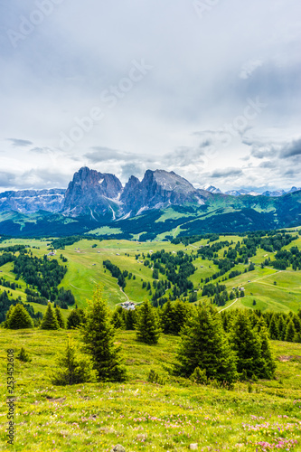 Alpe di Siusi, Seiser Alm with Sassolungo Langkofel Dolomite, a large green field with a mountain in the background