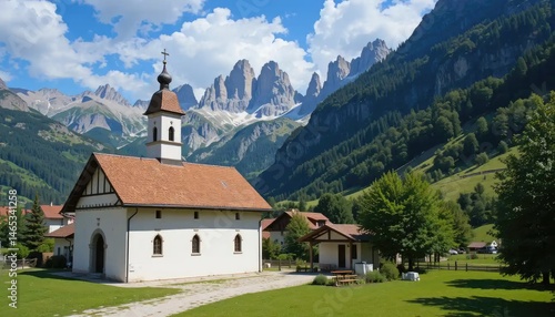 Alpine Church Amidst Majestic Peaks: A Serene Mountain Village