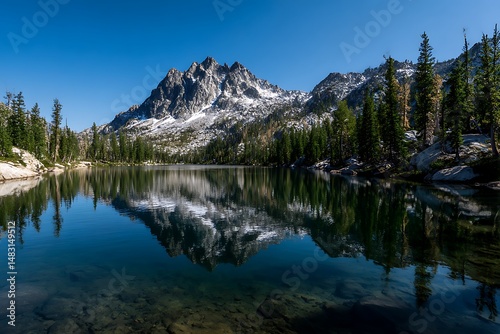 Alpine Lake Reflecting SnowCapped Peaks and Forest Under Clear Blue Sky Scenery