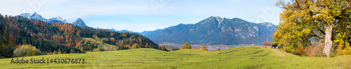 landscape, wide, panorama, alpine, alps, mountain, forest, autumn, autumn, bavaria, garmisch-partenkirchen, view, lookout, pictorial, colourful, october, september, nature, pasture, orange, green, yellow, brown, blue, meadow, vale, tree, beautiful, range, hut, kramer, sunshine, sunny, big, size, stunning, outdoors, nobody, hiking, season, scenery, fall