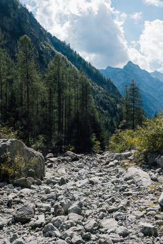 Alpine landscape countryside in sunny summer day in Val di Mello, Lombardy, Italy.