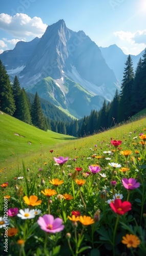 Alpine spring meadow, vibrant wildflowers, sunlit peaks, beauty, view, sky