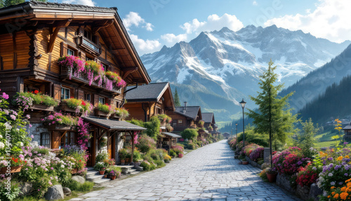 Alpine Village: Charming Mountain Houses with Blossoming Flowers