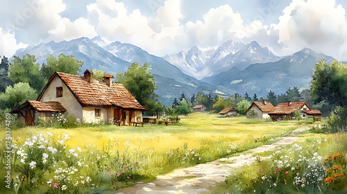Alpine village houses, summer field, mountain backdrop, idyllic scene, travel poster