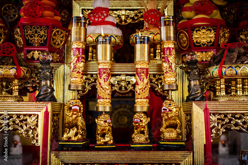 Altar in chinese shrine with wooden sculpture.