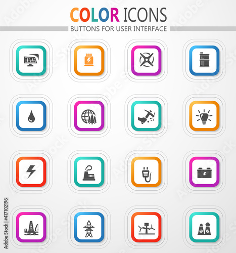 set, solar, industry, lightning, electricity, mining, interface, frame, power plant, fuel, colours, buttons, transformer, globe, decoration, lamp, battery, flat, ecological, energy, oil well, wind turbine, wire, vector, icon, nuclear, alternative energy, sun, water, nature, oil, factory, light bulb, stroke, forest