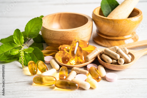 Alternative medicine herbal organic capsule drug with herbs leaf natural supplements for healthy good life.