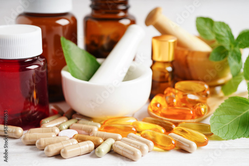 Alternative medicine herbal organic capsule with vitamin E omega 3 fish oil, mineral, drug with herbs leaf natural supplements for healthy good life.