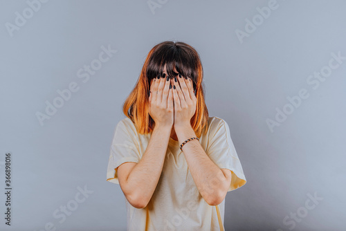 woman, young, portrait, face, people, beauty, white, person, hand, beautiful, hand, expression, cephalalgia, isolated, 1, pain, human, eye, sad, hair, business, stress, head, depression, shock