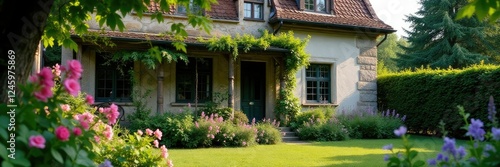 Altes Haus mit vielen Fenstern und bl?henden Hortensien, hortensien, garten
