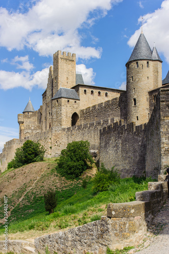 carcassonne, city wall, lock, mediaeval, southern france, tower, fortification, architecture, watchtower, fortified tower, heaven, blue, cloud, white, tour tourism, tourist attraction, vacation, travel, france