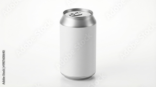 Aluminum beverage can mockup standing alone on neutral white surface.