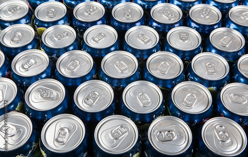 Aluminum beverage cans used in the food and brewing industries. Packaging made from recycled material.