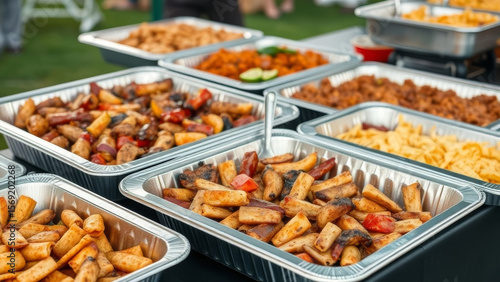 catering, buffet, food, banquet, grilled, event, party, meal, service, aluminium, tray, potato, sausage, vegetable, pepper, mushroom, meat, dinner, lunch, celebration, hospitality, eatery, epicure, cookery, company, vegetable, bar-b-q, picnic, culinary
