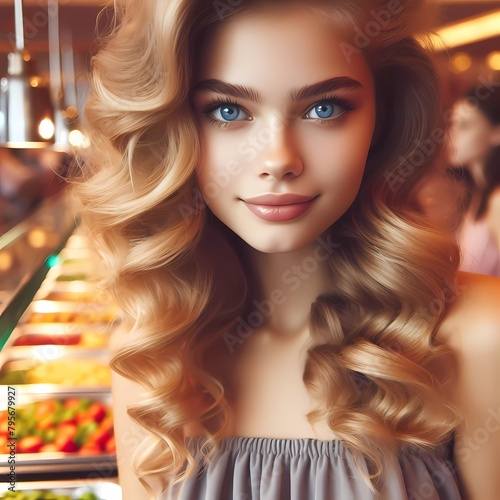 woman, travel, vacation, hotel, salad bar, blond, curl, recreation, meal