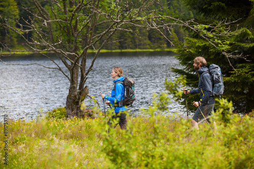 hike, hike, walk, way, tour tourism, arber, forest, bavaria, tree, grass, grass, green, nature, recreation, relaxation, vacation, travel, natural, active, activity, move, walk, stroll, persistence, outdoors, outside, couple, couple, man, woman, vacationer, backpack, see, body of water, water, shore