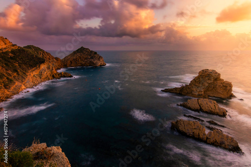 beach, rock, sunrise, water, sea, sun, cloud, colours, orange, red, blue, stone, vegetation, reflexes, sunset, light, horizon, nature, landscape, seascape, coast, water, wave, summer, vacation, many-coloured, evening, travel, cloud