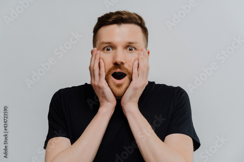 Amazed man being surprised while looking at camera