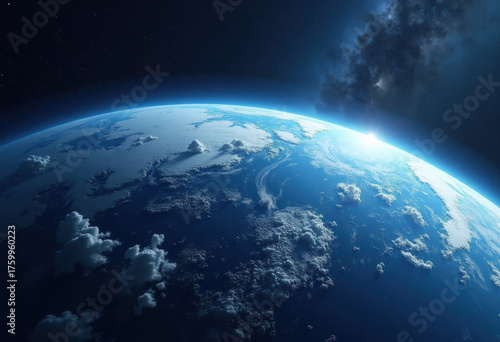 Amazing blue planet earth with ocean, clouds and continents in open space on the starry sky.