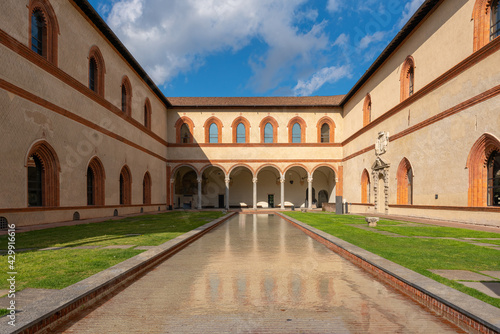 Amazing inner courtyard of the Sforzesco castle,sunny day and clouds, Milan,Italy