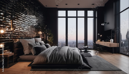 apartment, flat, bedchamber, bed, interior, room, hotel, home, furniture, house, window, design, lamp, luxury, pillow, wall, sofa, architecture, light, indoor, nobody, comfortable, decor, contemporary, double, indoor, ai, generated
