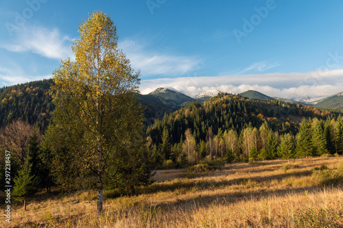 Amazing mountain landscape with colorful vivid sunset on the blue sky