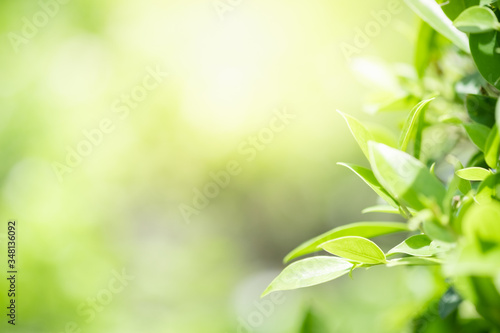 Amazing nature view of green leaf on blurred greenery background in garden and sunlight with copy space using as background natural green plants landscape, ecology, fresh wallpaper concept.