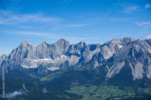 Amazing view to Dachstein mountain range in Styria near Ramsau Schladming on a sunny day with a clear blue sky and copy space for text