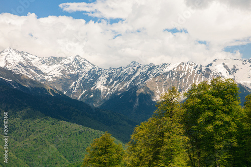 Amazing views in the Caucasus mountains. Snow-capped peaks, blue sky, sunny day