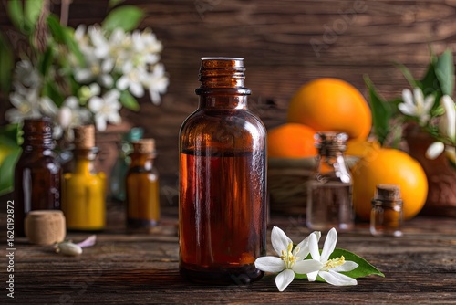 Amber glass bottle of essential oil, nestled amongst oranges, blossoms, and smaller bottles on a rustic wooden surface