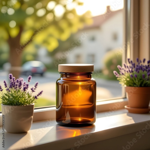 Amber Glass Bottle with Wooden Lid, Sunlight, Lavender, Windowsill, Minimalist, Calm, Serene, Natural Light, Wellness Product, Botanical, Home Decor.
