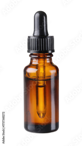 Amber glass dropper bottle with black lid for essential oil, tinctures, or herbal extracts on a clean background
