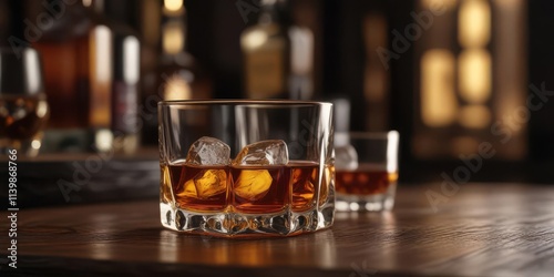 Amber whiskey rests in a rocks glass on a dark wood table , spirit, refreshment, chilled