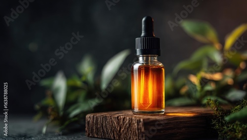 Amber-hued serum bottle, nestled on a wooden stand amidst foliage