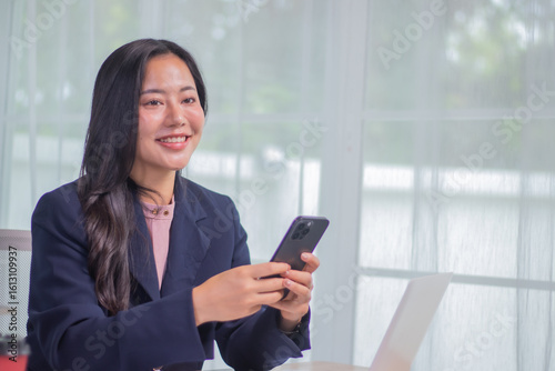 Ambitious Asian businesswoman working confidently at desk, analyzing charts and financial documents, focusing on strategy, planning and success.