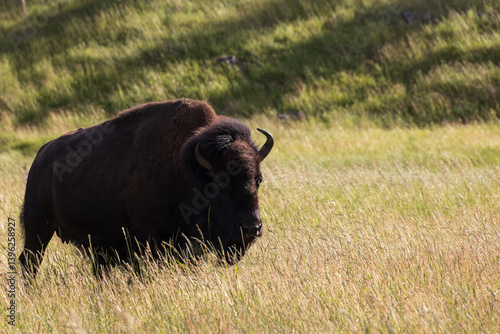 bison, grazing, eating, grass, majestic, powerful, shaggy, sturdy, us, animal, mammal, wildlife, wild, nature, bull, calve, brown, animal, fur, horn, field, outdoors, free, iconic, symbolic, rugged, roam, vacation, tour tourism, destination, copy space