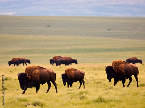 American Bison Herd Grazing in a Green Field, Wildlife, Nature, Prairie Landscape, Wild Animal, Summer, Outdoors, Wildlife Photography.