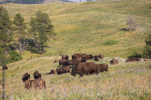 bison, herd, many, grazing, eating, grass, majestic, powerful, shaggy, sturdy, us, animal, mammal, wildlife, wild, nature, bull, calve, brown, animal, fur, horn, field, outdoors, free, iconic, symbolic, rugged, roam, vacation, tour tourism, destination, copy space