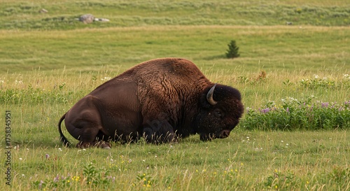 bison, animal, mammal, wildlife, nature, field, grass, green, brown, resting, sitting, daylight, environment, herbivore, fur, horn, landscape, calmness, peaceful, solitude, wild, isolated, serene, natural, prairie, meadow, grazing, bovine, conservation, ecosystem, habitat, flora, fauna, rural, america, north america, free, view, scene, background, copy space, commercial, editorial, image