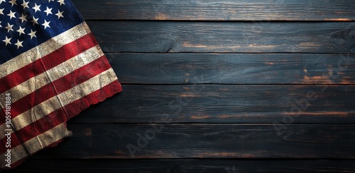 American flag draped on rustic wooden table background during a quiet moment of reflection