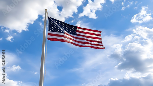 American Flag Flying Proudly Against a Clear Blue Sky with White Clouds : Generative AI