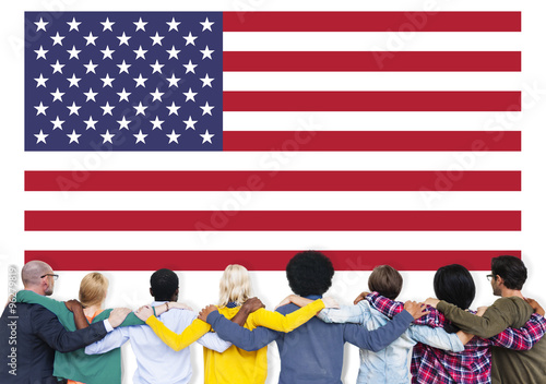 adult, america, american, american culture, american flag, casual attire, connection, country, diverse, diversity, ethnicity, flag, freedom, friends, friendship, government, group, hipster, holding, huddle, liberty, man, nation, national flag, partnership, patriotic, patriotism, people, politic, pride, backview, human relationships, support, team, teamwork, togetherness, us, woman, young