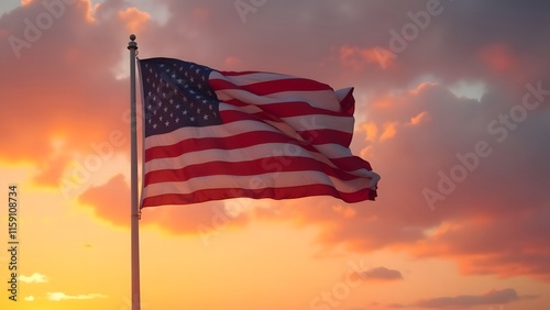 america, flag, sunset, sky, red, white, blue, star, stripes, patriotic, national, symbol, pride, freedom, liberty, independence, american, nationalism, country, wave, wind, colours, dramatic, vibrant, beautiful, photo, image, sunrise, cloud, texture, background, patriotism, hope, glory, powerful, inspiring