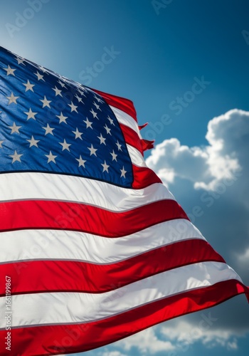 flag, american, star, stripes, patriotic, national, symbol, freedom, liberty, america, united, state, country, nation, independence, patriotism, wave, wind, blue, sky, cloud, red, white, fabric, textile, daytime, bright, vibrant, colourful, vertical, closeup, background, texture, pride, democracy, government, history, culture, heritage, nationalism, political, powerful, strength, oneness, hope