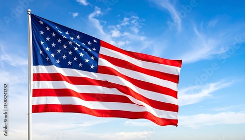 flag, american, star, stripes, red, blue, white, waving, sky, cloud, patriotic, national, proud, freedom, liberty, united, state, banner, symbol, image, graphic, design, illustration, beautiful, vibrant, colours, detail, horizontal, symmetry, texture, emblem, nation, glory, america, proudly, display, symbolism, displaying, majestic, nationalism, pride, optimism