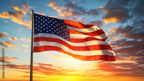 American flag waving in the wind against a sunset sky background with copy space