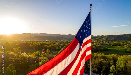 flag, american, sunset, vale, mountain, countryside, rural, landscape, waving, patriotic, pride, america, view, scenic, sunrise, outdoors, nature, freedom, colours, red, white, blue, sky, tree, cloud