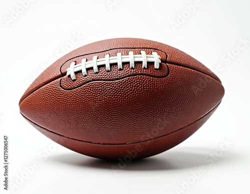 American football ball isolated on white. Sport equipment. Brown leather texture, white laces of pigskin oval sphere for team game championship, touchdown. American college sport. Professional match.